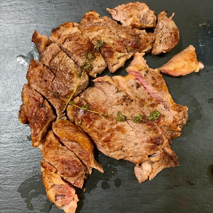 19. Add vegetable oil and cook steak to your liking; tip: if using, add garlic and thyme only after the first flip, otherwise it might cook too long and burn, imparting an unpleasant bitter flavour