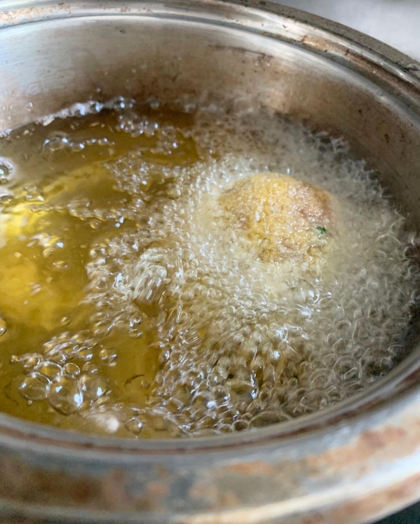 16. With your dry hand, take a large spoon and lower each egg carefully into hot oil