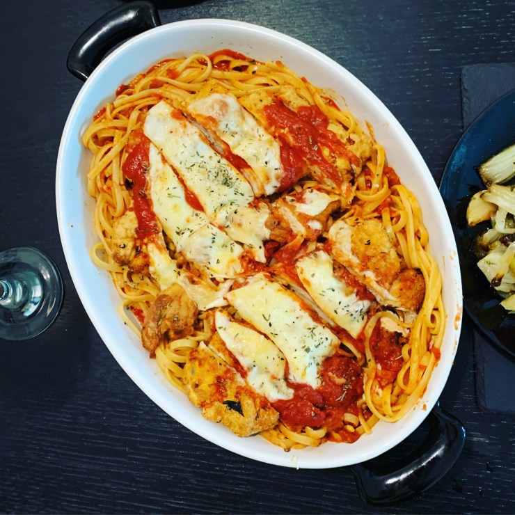 We had guests over with kids, immediately this dish came to mind. There isn’t a single kid who does not like tomato pasta. For the adults, the breaded and cheesy chicken adds a layer of enjoyment. Use tomato passata for the marinara sauce, or replace with your own slow-cooked sugo if available. Be sure to wash your hands after handling the chicken.