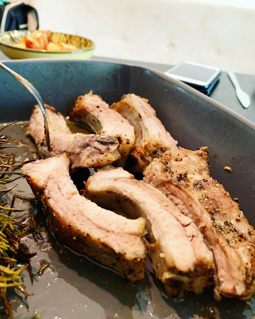 1. Cook ribs in pre-heated oven at 220’c for 30 minutes, with sprigs of rosemary on top, touching the fat