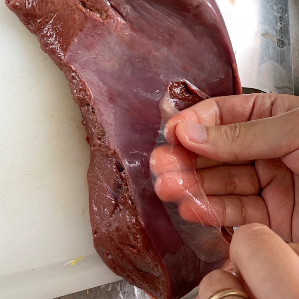 9. With your fingers, poke a hole in the liver to release the skin
