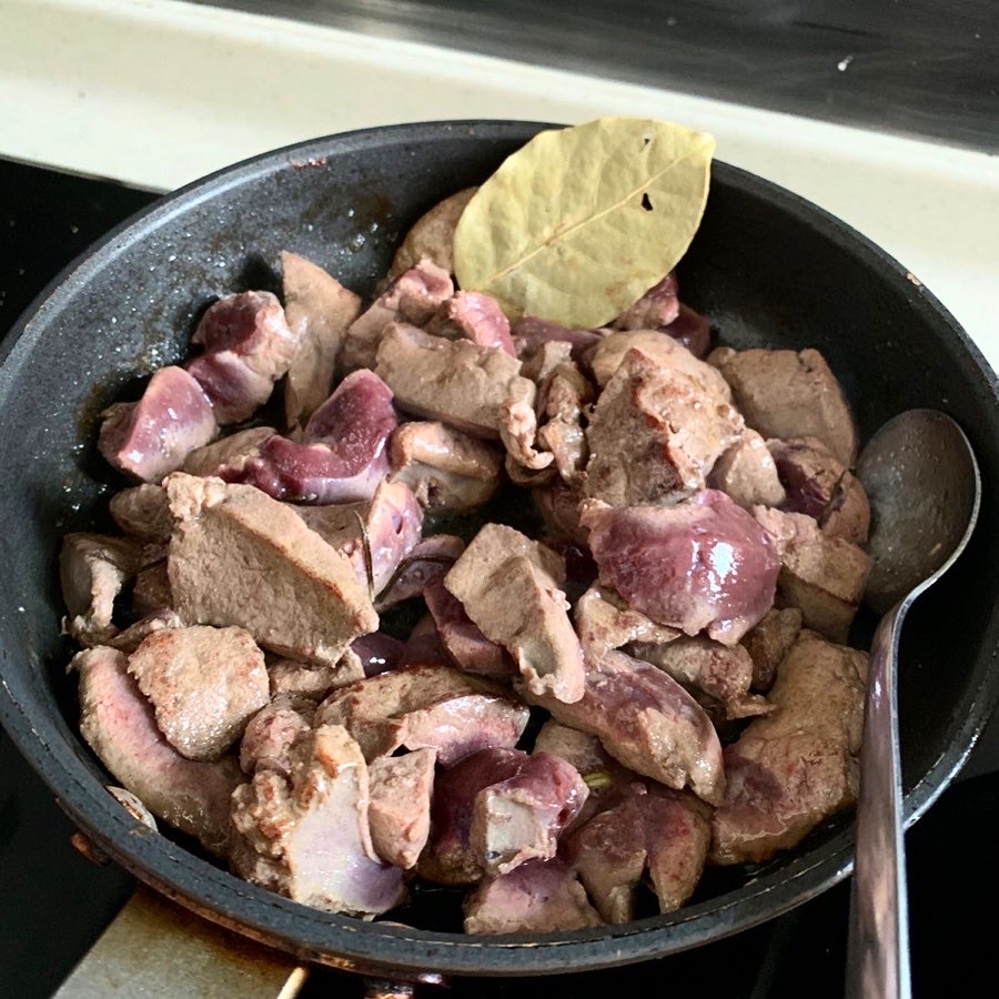 13. Add sage, bay leaf, plenty of salt, and pepper, to the liver