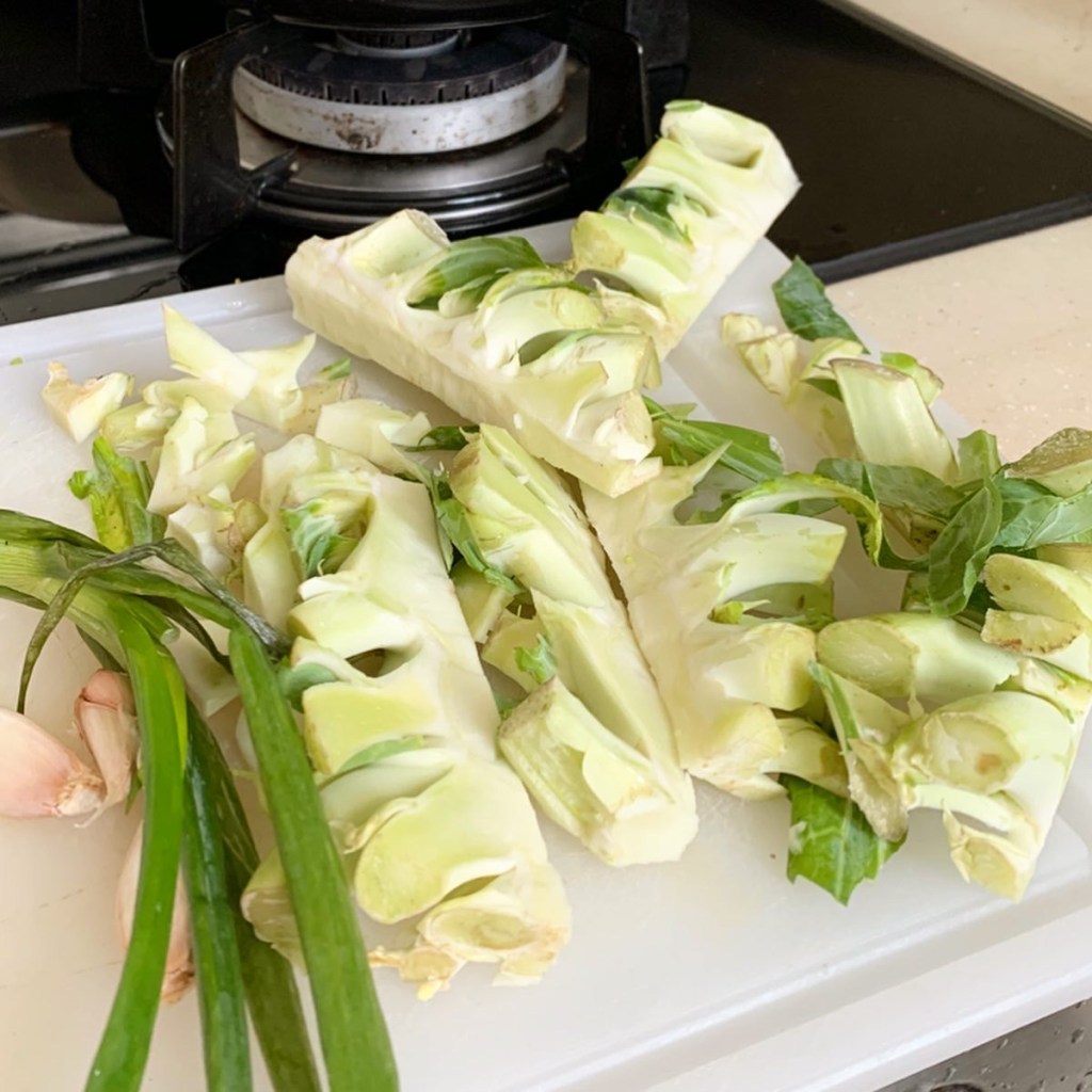 5. In a large pan, heat oil and garlic until garlic starts to bubble