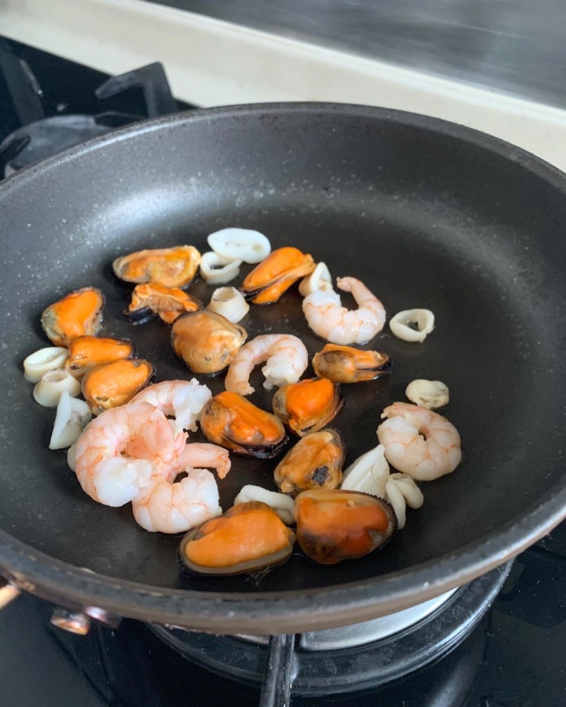 10. Once pasta is almost done – still a bit raw In the centre – transfer to the frying pan